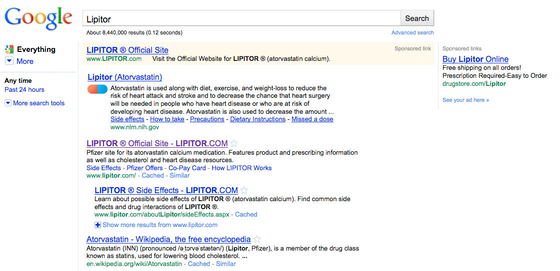 Just below the paid Lipitor ad at the top is the NIH OneBox "ad," which is not really an ad because it is not a paid placement. But I'll just call it an ad because it looks like one and perhaps Google users may think it's an ad.